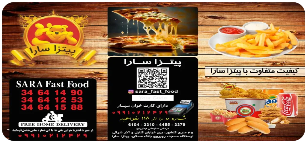 فست فود سارا در بلوار ۴۵ متری گلشهر کرج منو متنوعی از پیتزاهای آمریکایی و ایتالیایی، برگر، ساندویچ، سوخاری و پیش‌غذاها را با قیمت‌های رقابتی ارائه می‌دهد و می‌توانید غذا را هم به‌صورت حضوری سفارش دهید یا از طریق سرویس‌های آنلاین مثل اسنپ‌فود سفارش بدهید.